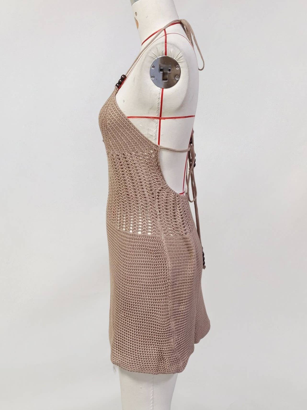 Lace-Up Halter Neck Knit Beaded Beach Cover-Up