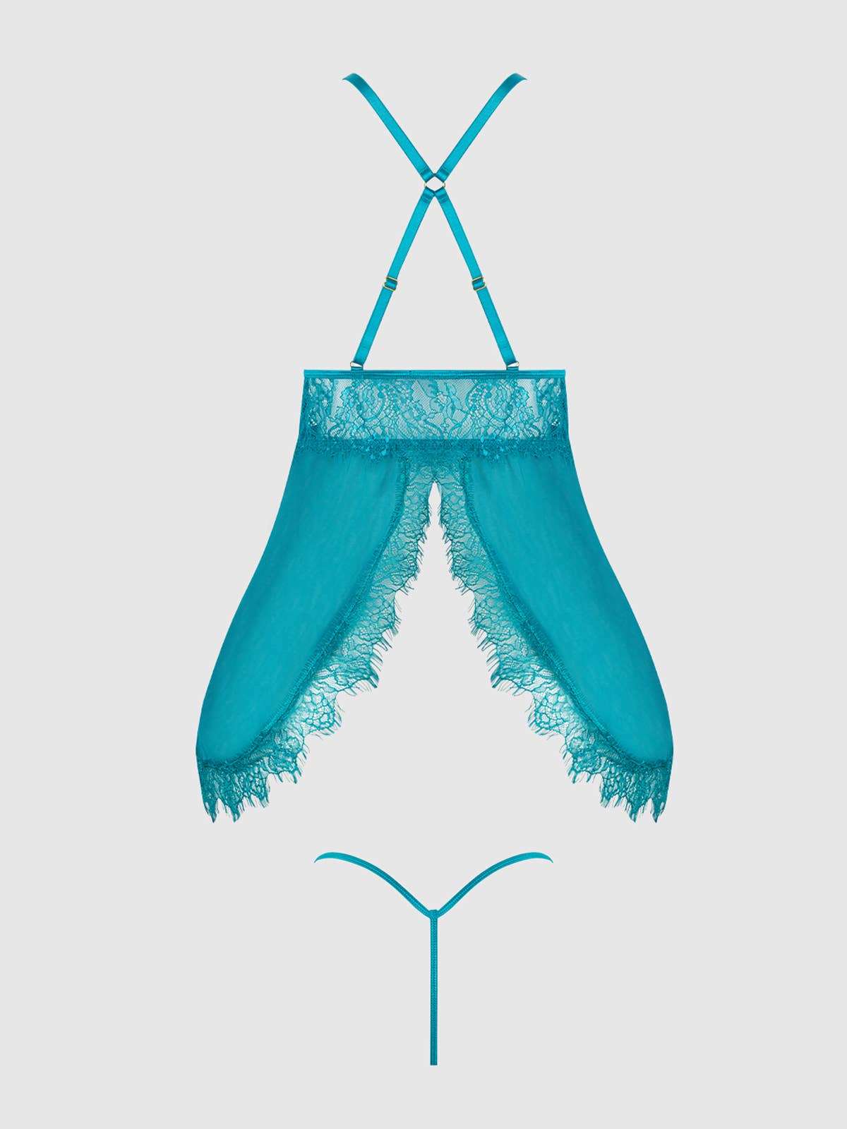 - Daring lace front g-string panty with delicate straps.